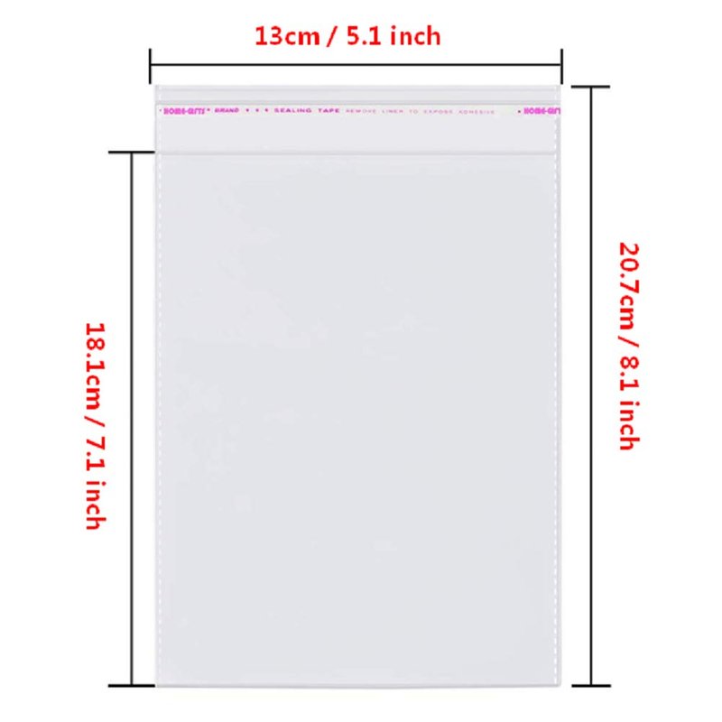 300 Pack clear treat self-adhesive sealing bags, enough to meet your different handicraft and food packaging storage needs, Birthday Gift Wedding Party Christmas Holiday Season Favors. The size of cello bag is slightly over 5"x7" (not include flap, flap width is 1 inch, adhesive tape strip is on the flap). Can fit 5x7 inches cards, photos, brochures, prints, flyers, paper documents.