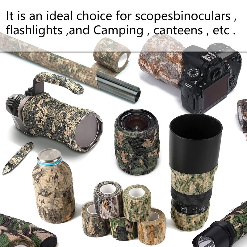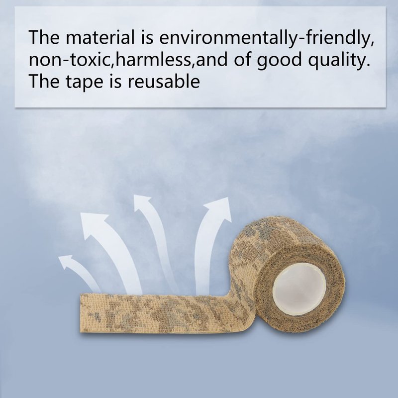 Made of polyester, non-woven fabrics, no odor. Camping camouflage stretch tape protects your hands from cold objects (extremely useful on metal surfaces). It also takes away the sheen of reflective surfaces and helps you blend in with the environment.