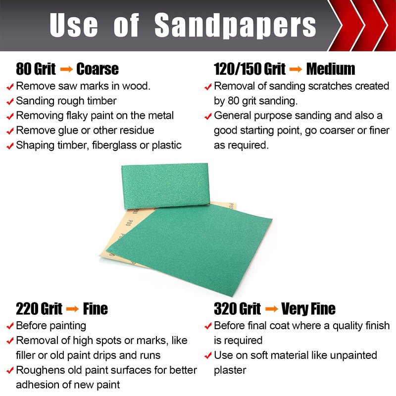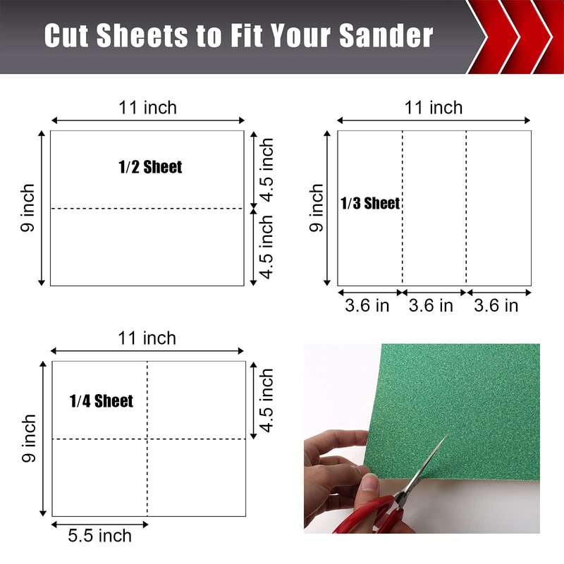 - [Cut It Into Different Size] Premium sandpaper sheets are excellent to use for hand sanding and machine polishing. You could fold or cut them into the size of 1/4, 1/3, 1/2 for a power tool sander or sanding block to attach all sizes. Ideal for woodworking, metalworking, fiberglass, paint, furniture, drywall, lacquers, putty, primers, and fillers.