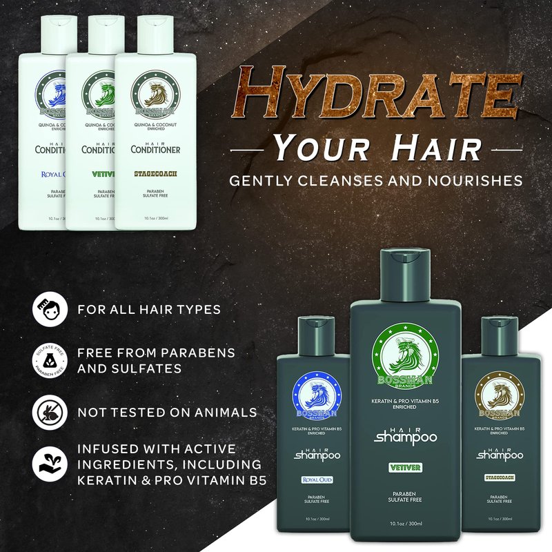 - Bossman Shampoo is free of questionable additives including parabens and sulfate. Bossman Shampoo is also free from any animal testing. Great for all hair types including dry, damaged, over-processed, color-treated hair. Bossman Hair Conditioner is your second stop to the hydration station. It’s time men took their hair care routine more seriously and no better way to do it than with the trusted brand, Bossman.