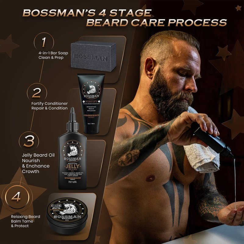 Warm a small amount of our Relaxing Beard Balm into your palms and work through your beard from root to tip. For better results, use the Bossman Pear Wood Comb or Bossman Boar & Nylon Bristle Brush to distribute evenly. Use the balm as part of our 3 step process : 1) Fortify Conditioner for use in the shower, 2) Jelly Beard Oil for use after the shower, 3) Relaxing Beard Balm to seal it all in. Our Relaxing Beard Balm replenishes a dry beard with a helping of proprietary blends of hair strengthening natural oils and butters. Bossman Beard Balm will help soften, condition, repair dry splitting hairs, and nourish new growth. This versatile beard care product keeps your beard moisturized, free from frizz, and easily manageable.