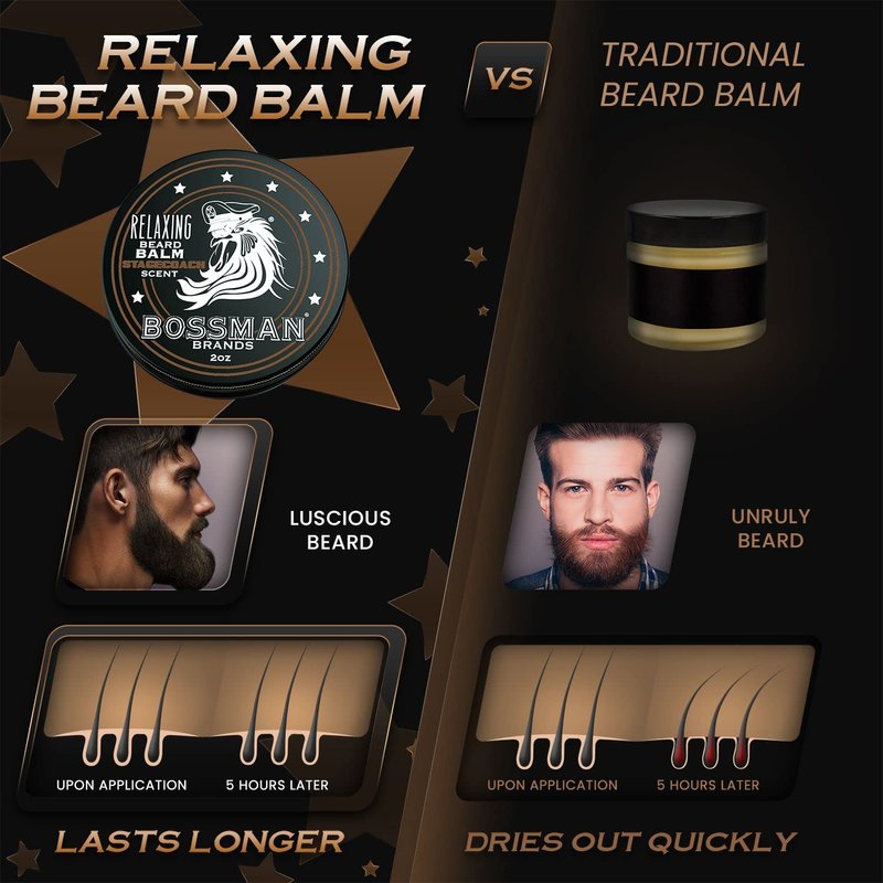 - Beard Balm to Nourish, Thicken, Strengthen Hair: You'll be the guy with the thickest beard in town with our Bossman Relaxing Beard Balm. It features a host of natural ingredients such as Mango and Shea Butter that hydrate and retain moisture in the hair follicles and pores to keep your beard healthy and help it grow thicker and fuller