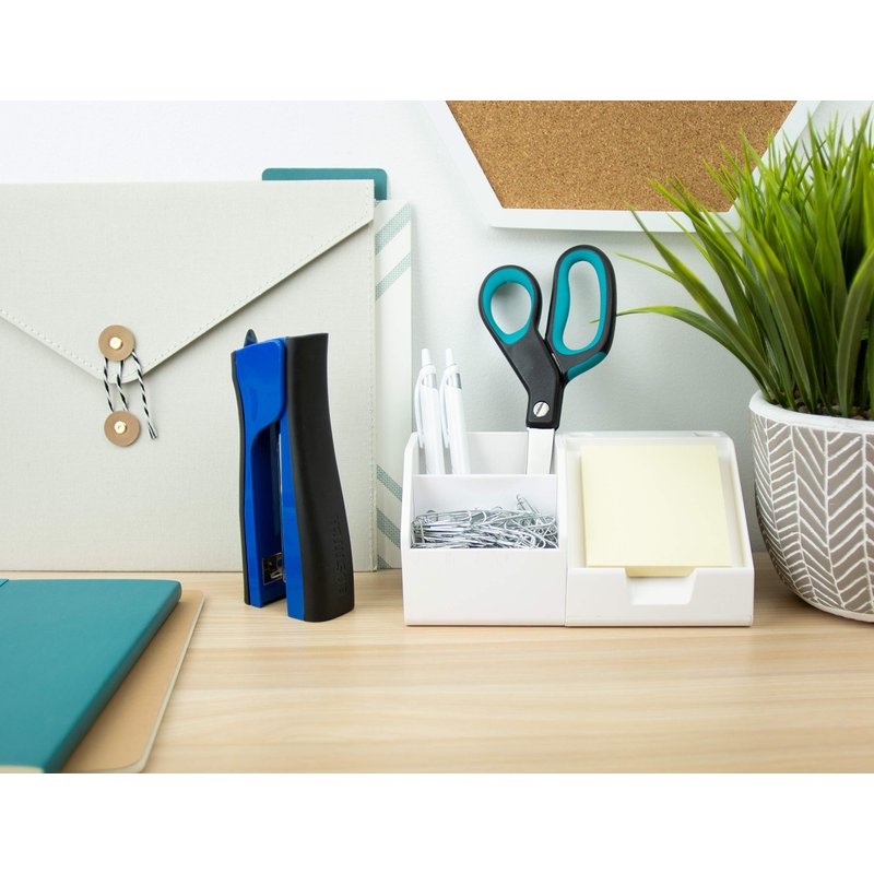 - Built-in pencil sharpener, staple remover, and hidden staple storage