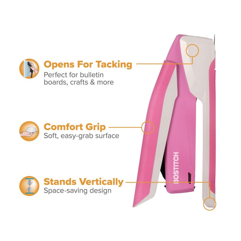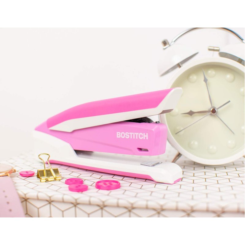 Bostitch Office InPower Spring-Powered Desktop Stapler, 20 Sheet Capacity, One Finger Stapling, Includes 210 Staples, Jam Free, Opens for Tacking, Breast Cancer Awareness Pink