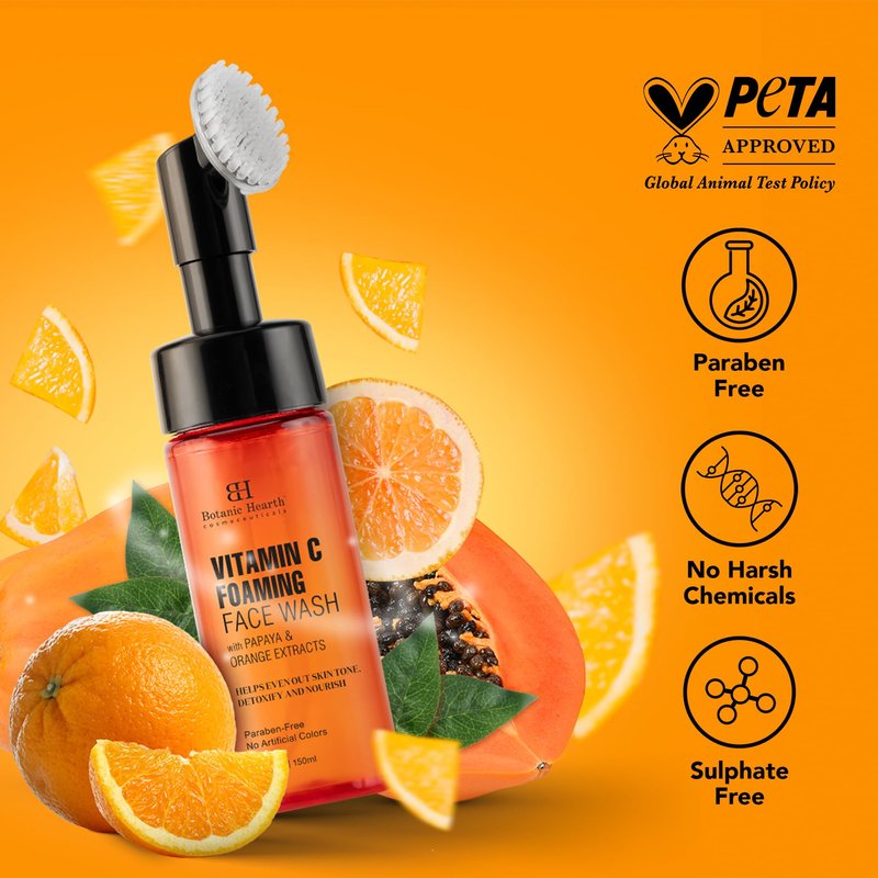 Botanic Hearth Vitamin C Foaming Face Wash with Papaya & Orange | Extracts Built-In Silicone Brush | For Cleansing & Glowing Skin | Paraben & Sulphate Free | Face Cleanser for Women & Men | 5.1 fl oz