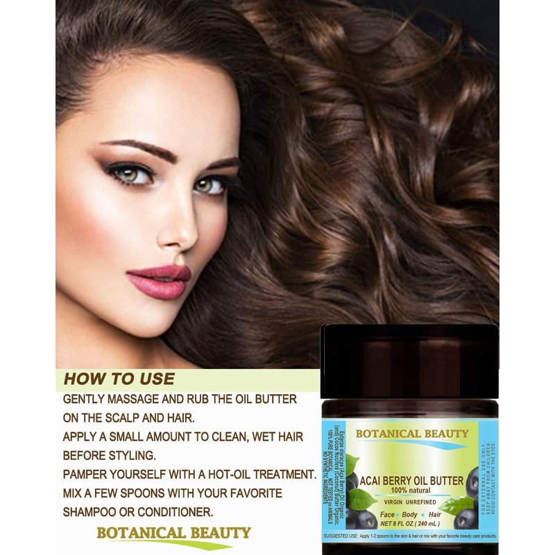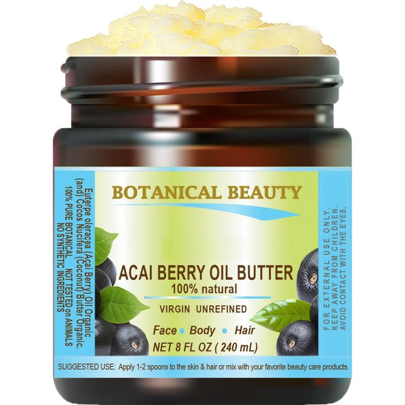 Botanical Beauty ACAI BERRY OIL BUTTER RAW VIRGIN UNREFINED BLEND for Face, Body, Hair, Lip and Nails. Organic Coconut Oil and Acai Berry Oil 8 Fl. oz. - 240 ml. Rich in Vitamin E