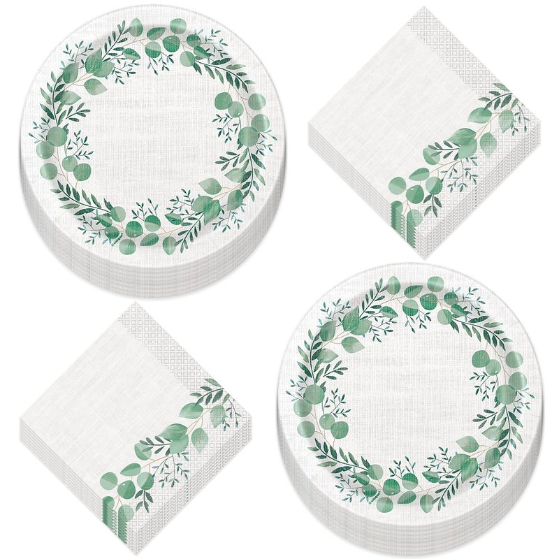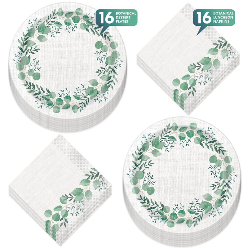 Botanical Garden Eucalyptus & Linen Paper Dessert Plates and Guest Napkins (16 Plates & Napkins)