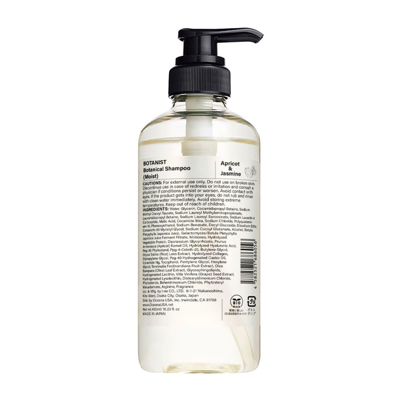 Experience the ultimate hair transformation with Botanist Shampoo. Designed to achieve silky-smooth hair, this shampoo features a triple haircare system that balances proteins, moisture, and lipids for optimal hair health. Enriched with nourishing ingredients like sugarcane-derived molasses, rice-derived ceramides, macadamia nut oil, and botanical micro-protein, it provides gentle deep cleansing without stripping natural oils. Free from silicones, sulfates, and synthetic pigments, it keeps your scalp healthy and protected. The invigorating apricot and jasmine fragrance adds a luxurious touch to your hair care routine.【INGREDIENTS】Water, cocoyl methyl taurine, cocamidopropyl betaine, sodium laureth-4 carboxylate, lauryl betaine, birch sap, galactomyces/fermented birch sap, macadamia nut fatty acid phytosteryl, hydrolyzed vegetable protein, honey, glycosphingolipid, glycyrrhizinic acid 2K, grape seed extract, Terminaria ferruginandiana fruit extract, jojoba seed oil, apple fruit extract, sake lees extract, hydrolyzed collagen, hydrolyzed hyaluronic acid, ceramide NG, hydrolyzed keratin (wool), arginine, malic acid, PEG -30 phytosterols, hydrogenated lecithin, phytosterols, hydrogenated lysolecithin, glycerin, BG, DPG, polyquaternium-10, lauramidopropyl betaine, lauramidopropyl lauryl hydroxysultaine, hydroxysultaine, decyl glucoside, PEG-150 distearate, Ceteareth-60 Myristyl Glycol, PEG-30 Hydrogenated Castor Oil, PPG-4 Ceteth-20, PEG-40 Hydrogenated Castor Oil, Cocamide MEA, PEG-400, Pentylene Glycol, Hexylene Glycol, Behentrimonium Chloride, Distearyldimonium chloride, EDTA-2Na, ethanol, sodium chloride, tocopherol, phenoxyethanol, sodium benzoate, fragrance