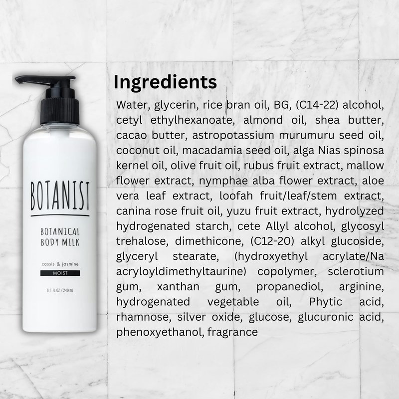 【Live in harmony with plants. Botanical Lifestyle】Indulge your skin with the BOTANIST Botanical Body Lotion, a premium moisturizer crafted to provide superior hydration and care. Infused with natural botanical extracts, this body lotion offers a gentle, nourishing touch, making it perfect for those who prefer organic skincare. The unique double fragrance formula leaves a delightful scent that lingers, ensuring you smell fresh and pleasant all day. Designed for dry skin, it delivers intense moisture to keep your skin soft, smooth, and well-hydrated. The non-greasy, lightweight formula absorbs quickly, making it ideal for daily use without any sticky residue. Trust in the excellence of Japanese skincare with BOTANIST and give your skin the care it deserves.【INGREDIENTS】Water, glycerin, propanediol, caprylic / capric triglyceride, stearic acid, glycosyl trehalose, shea butter, cocoa butter, astropotassium murmur seed butter, almond oil, coconut oil, macadamia seed oil, argania spinosa kernel oil, apricot juice, rose damask flower extract, akebi extract, peach juice, squalane, hydrolyzed hydrogenated starch, beeswax, Polysorbate 60, sorbitol, (hydroxyethyl acrylate / sodium acryloyldimethyl taurate) copolymer, diglycerin, dimer dilinoleic acid (phytosteryl / isostearyl / cetyl / stearyl / behenyl), polyglyceryl-10 stearate, PEG-40 stearate, creatine, inositol, sclerotium gum, Lauroyl glutamate di(phytosteryl/octyldodecyl), glycyrrhizic acid dipotassium acid, xanthan gum, sorbitan isostearate, sodium hyaluronate, PCA-Na, BG, hydroxypropylcyclodextrin, phenoxyethanol, methylparaben, propylparaben, fragrance