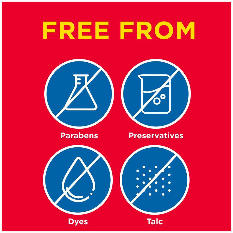 - Free from dyes, preservatives, parabens and talc