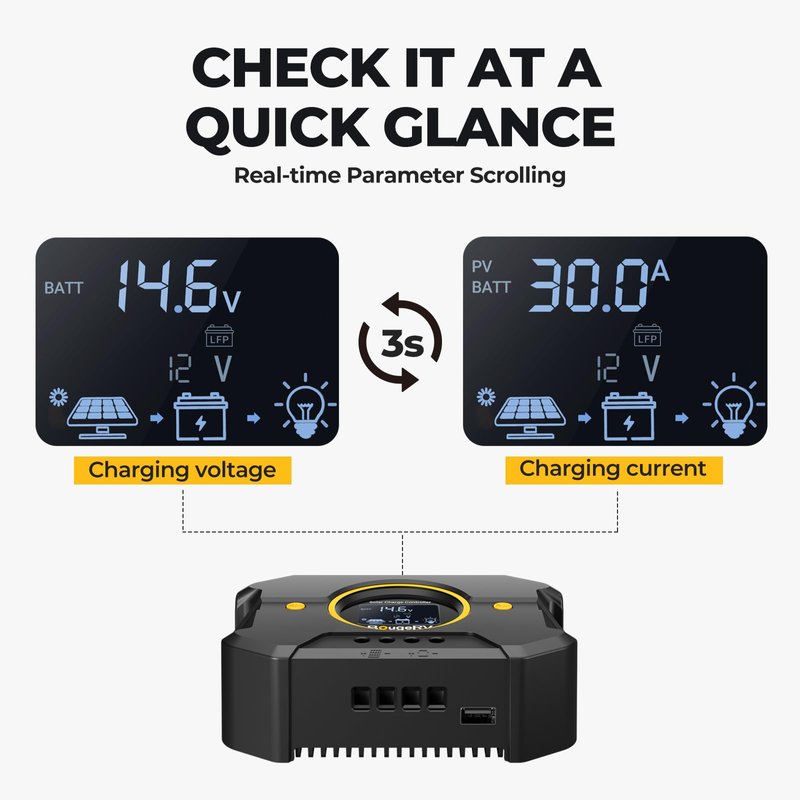 - EASY-READ BACKLIT DISPLAY: To check the PV status and the Battery status easily, the 10A solar panel regulator will cycle the PV input current and the battery voltage on the main interface with real-time value every 3 seconds. Larger size screen and 50% brightness in no operation, the solar charge controller is easy to read in dim light. Allows you to see exactly what the controller was doing and how much power is being drawn in from the panel(s).