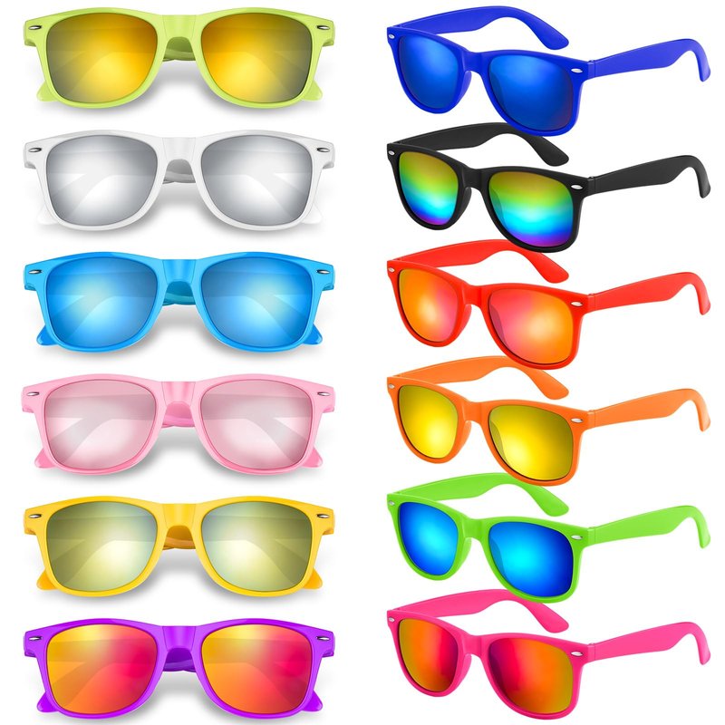 Neon Colorful Sunglasses with Mirrored Lens in Bulk Specifications: Material: PP materials 12 Neon colors: Red/ Yellow/ Green/ Blue/ Orange/ Rose red/ Pink/ Purple/ Black/ White/ Deep-blue/ Light-yellow Frame wide: 147mm/ 5.7 inches Frame tall: 48mm/ 1.8 inches Leg length: 145mm/ 5.6 inches Suitable for any occassion: made it as a gift for birthday party, graduation party, easter party, bridal party, bachelorette party, gender reveal, fiesta, pool party, beach party favors