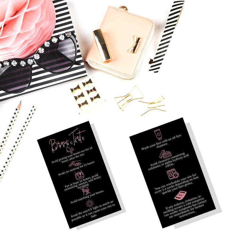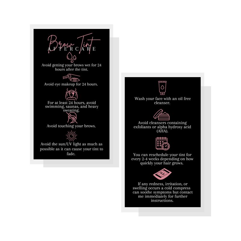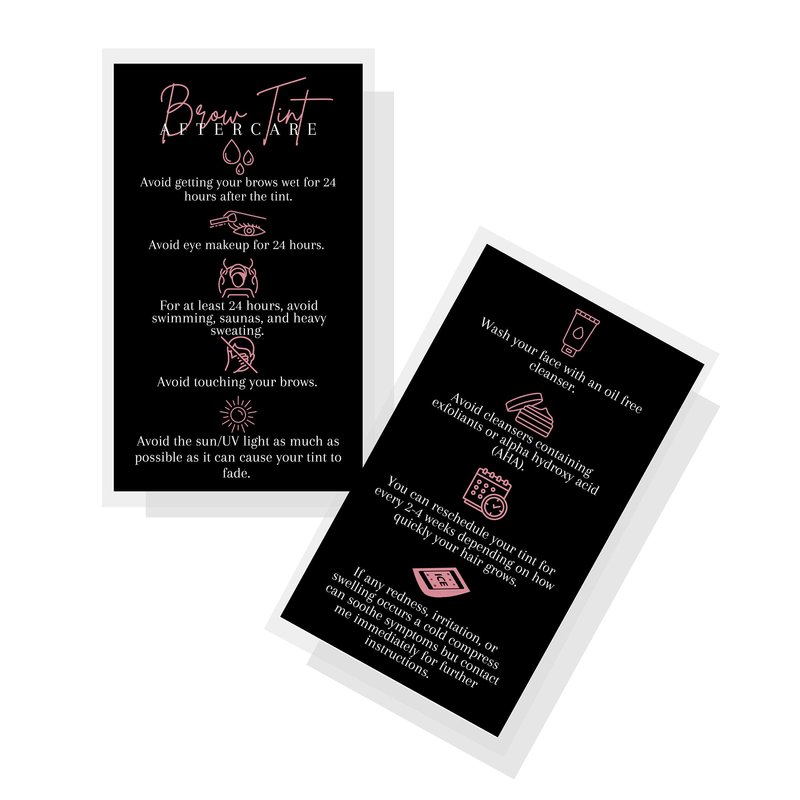 Boutique Marketing LLC Brow Tint Aftercare Card | 50 Pack | 2x3.5” inch Business Cards | Matte Black with Rosey Pink Design