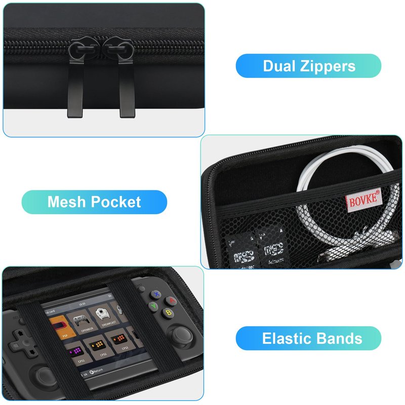 - The Anbernic RG35XX H case interior main compartment features elastic bands to keep your retro handheld game console protected. The RG35XX H game travel case organizer also has a top mesh pocket to keep the extra USB charging cables, SD cards and other essentials.