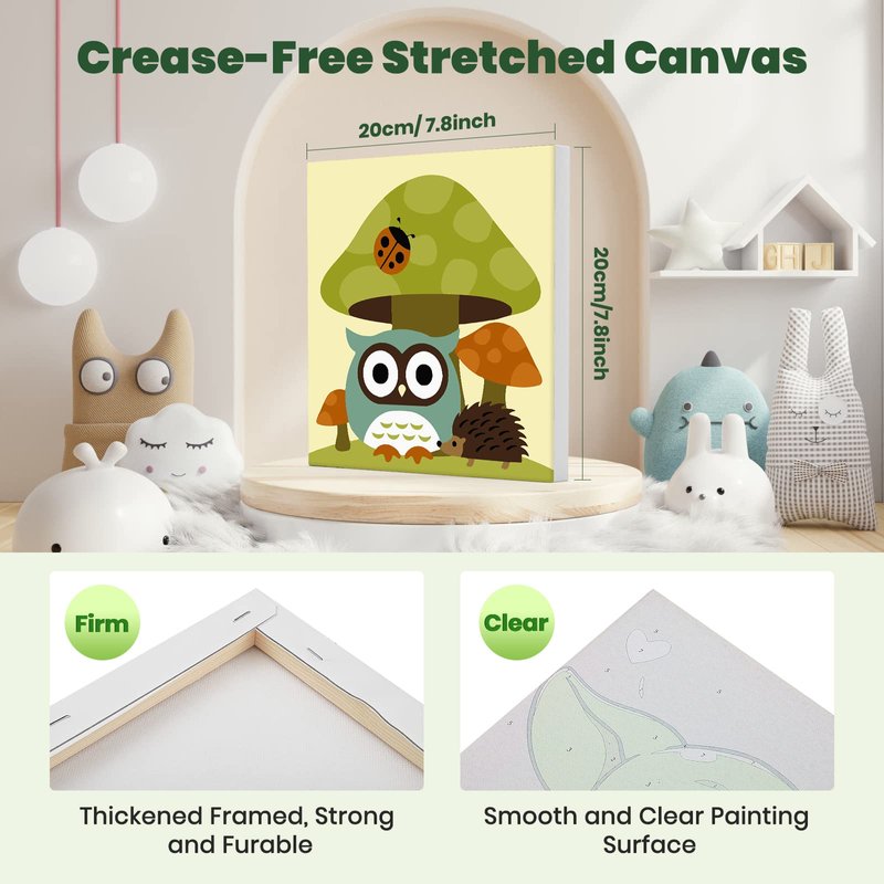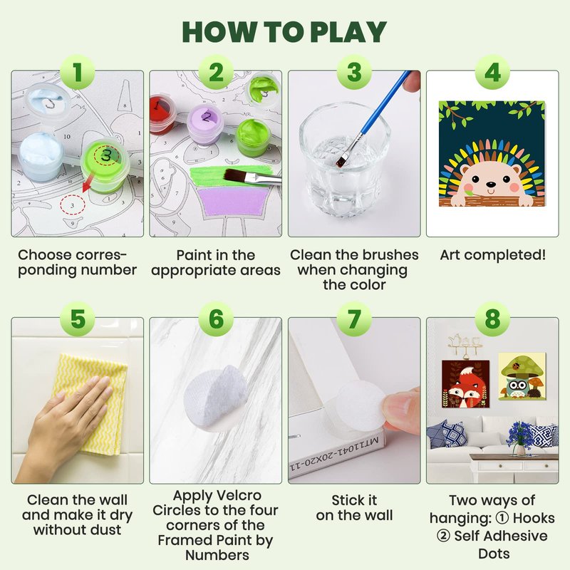 - What You Will Get:Each kid's number painting includes a wooden frame canvas, and 3 brushes with different tips. Hang their masterpiece with ease using the included Hooks or Self Adhesive Dots for stunning wall decor