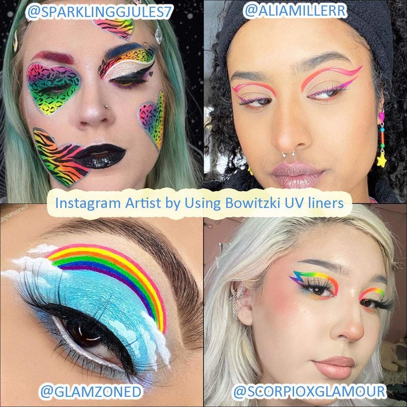 - Bowitzki Retro Liners /FX formula delivers a punch of solid opaque colour that glow under UV/blacklight. It’s smudge proof and transfer resistant – your colour won’t fade until it’s removed.