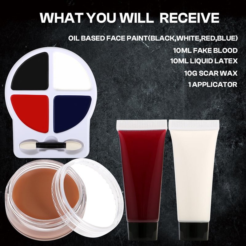 - Complete Professional Special Effects Makeup Kit:Package Include 4 colors Face Paint,10m Liquid Latex, 10ml Fake Blood, 10g Scar Wax and1 Applicator.Perfect for your SFX makeup need.