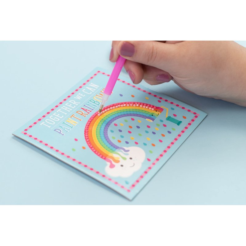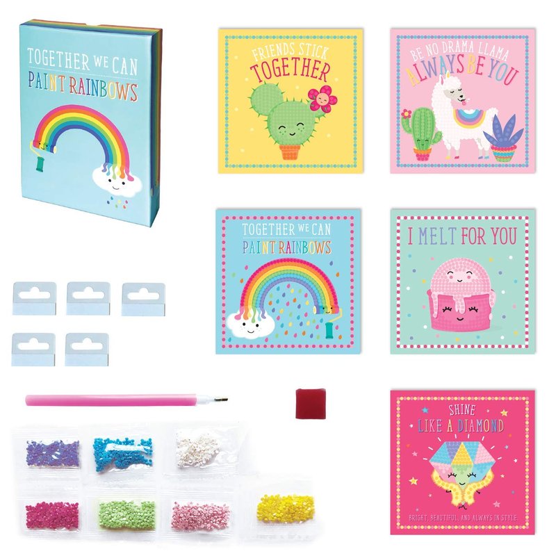 - Complete set includes 5 artboard cards, 7 colors of glimmery plastic faux diamonds, 1 stone pick pen tool, 1 square of pen wax, 5 plastic art hangers and instruction leaflet; For ages 6 years and older
