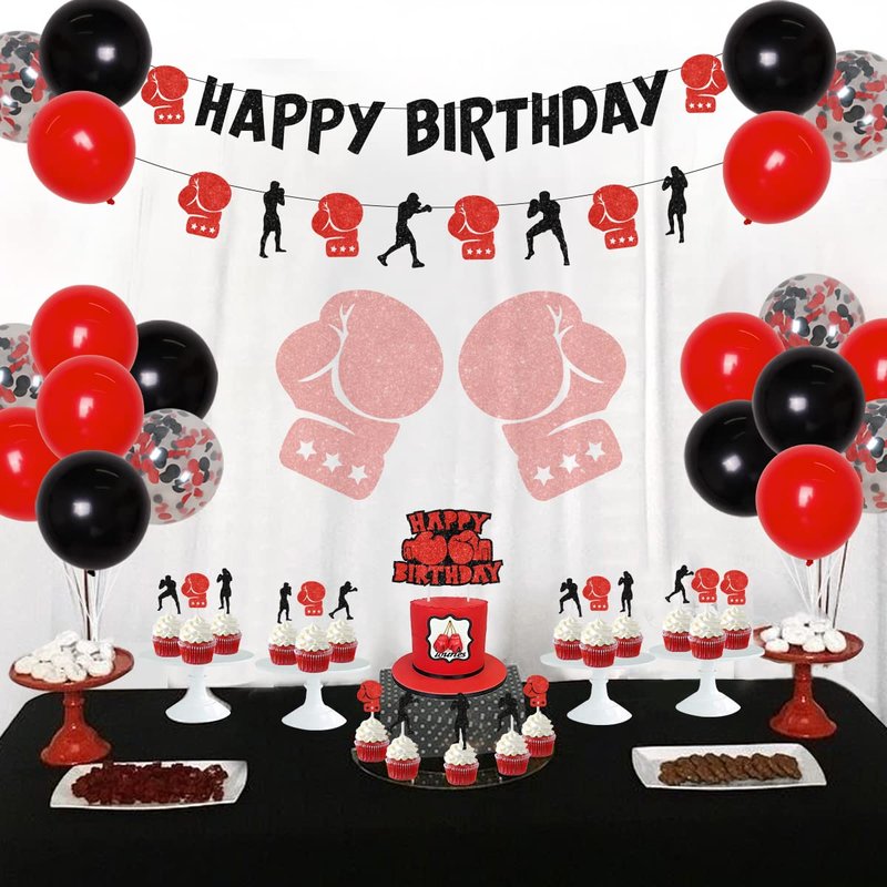 Boxing Match Birthday Party Decorations for different theme party occasions. For boxing birthday party, wresting party, fight night theme party, wresting theme competition, boxing theme competition and wresting fans activity. And also for outdoor and indoor occasions, girls and boys. It is easy to decorate and can save your time. You can get: 1x boxing HAPPY BIRTHDAY banner 1x boxing theme garland 1x boxing Happy Birthday cake topper 24x boxing cupcake toppers 5x red latex balloons 12 inches 5x black latex balloons 12 inches 5x red black confetti transparent latex balloons 12 inches 2x gold cup foil balloons 24* 25.5 inches