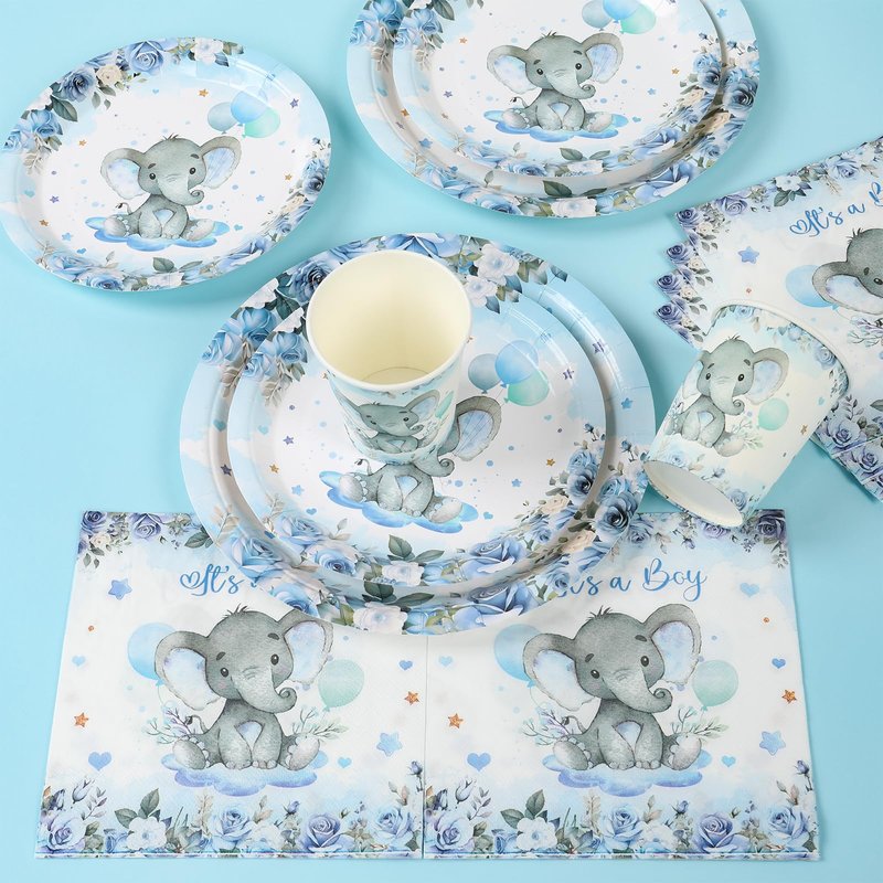 - Blue Floral Elephant Plates Set - Blue color for boy or girl, printed with prominent elephant. This blue elephant disposable dinnerware kit are perfect for any themed party whether it's for boys or girls. Impress your guests with this set of elephant party supplies set