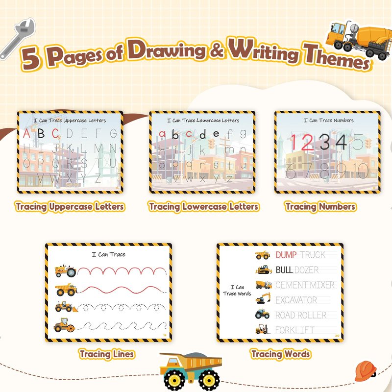 - 11 Engineering Vehicle Themes & 5 Writing Pages: Each theme covers different construction vehicle elements, including shapes, alphabet, colors, numbers, sizes, vehicles, compare, direction, tools shadow, puzzle