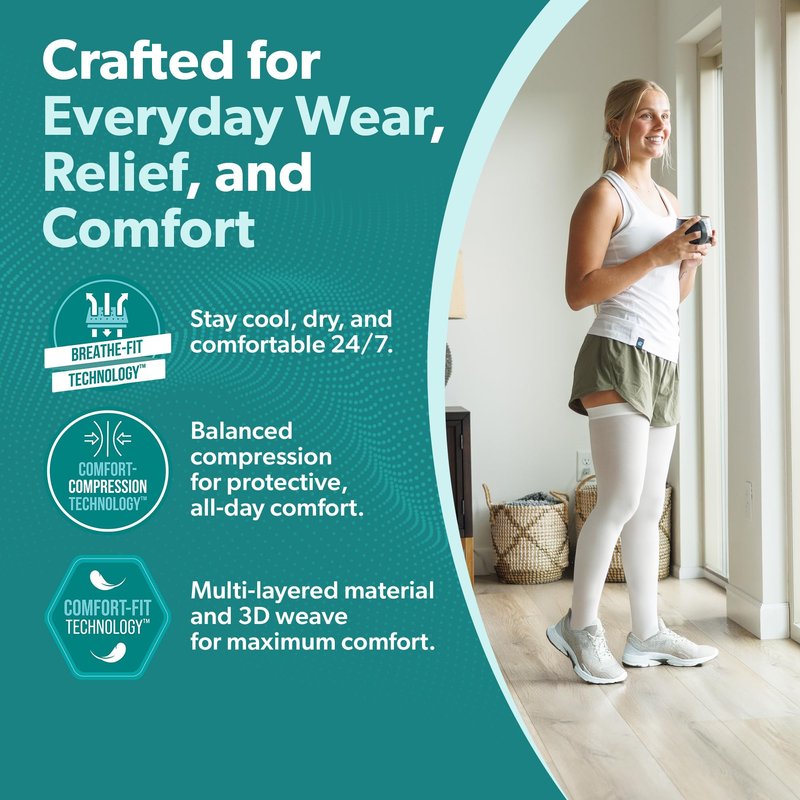 - Stay-Put Fit with Silicone Thigh Band: Secure silicone grip keeps stockings in place without rolling, slipping, or pinching, making them reliable for all-day or overnight wear during recovery, travel, or long periods of sitting and standing