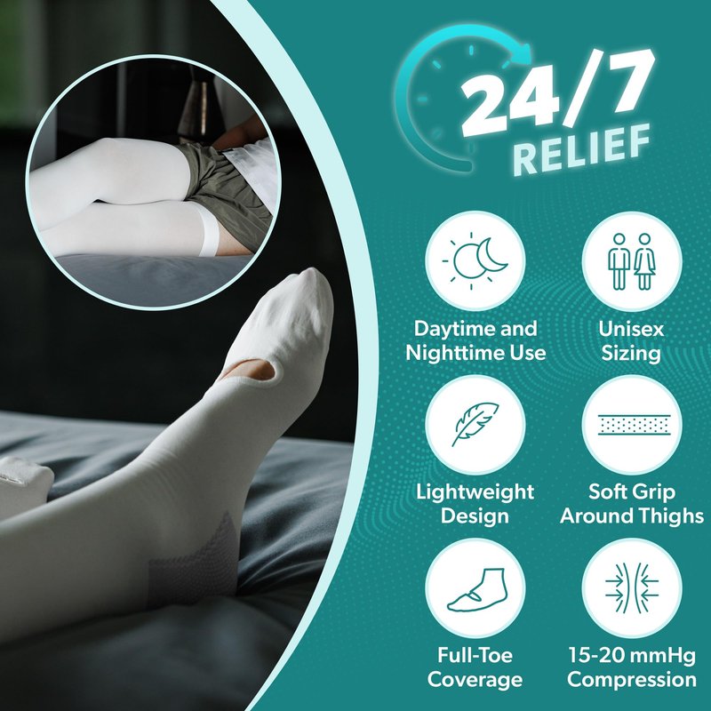 - Graduated Compression for Circulation: Medical-grade TED hose stockings apply 15–20 mmHg of graduated compression for circulation of gentle pressure at the ankle that decreases toward the thigh to promote healthy blood flow, reduce swelling, cramping, and leg fatigue, and support recovery from DVT, varicose veins, and edema