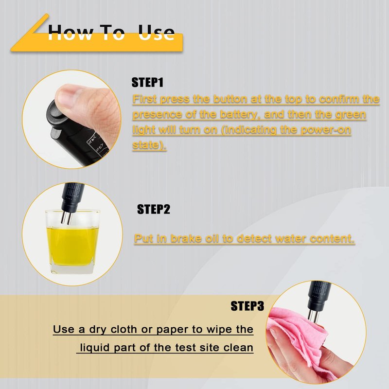 - Convenient and quick: This brake fluid tester is easy to use, press the button, insert the test pen, the indicator is accurate to 1%, and you can receive the result in seconds. To save electricity, the test pen will automatically turn off the power after 20 seconds each use to save power.