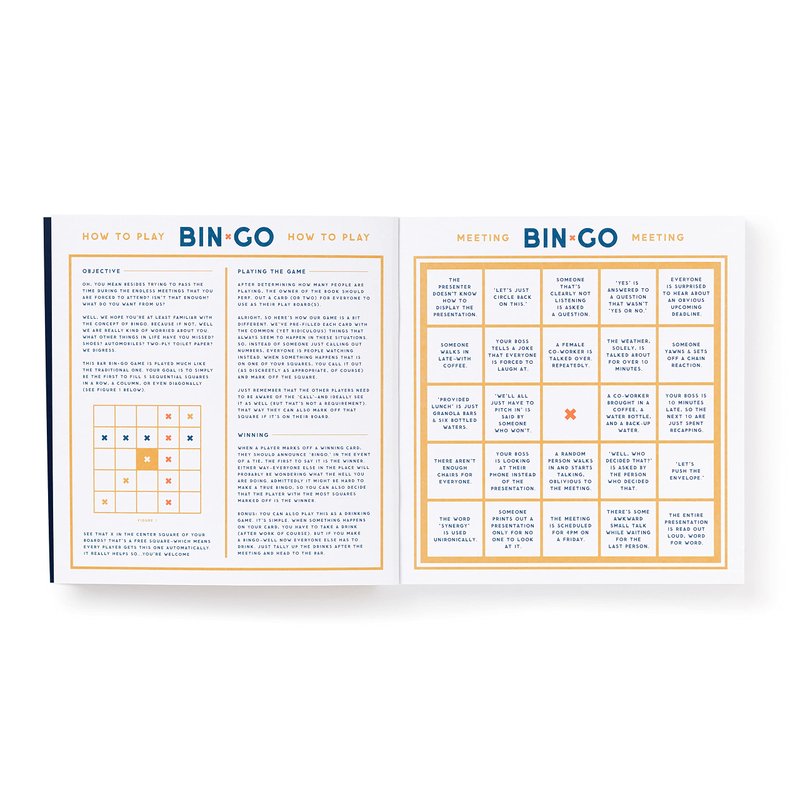 - Features two distinct people-watching bingo games–one for meetings and one for general office life.
