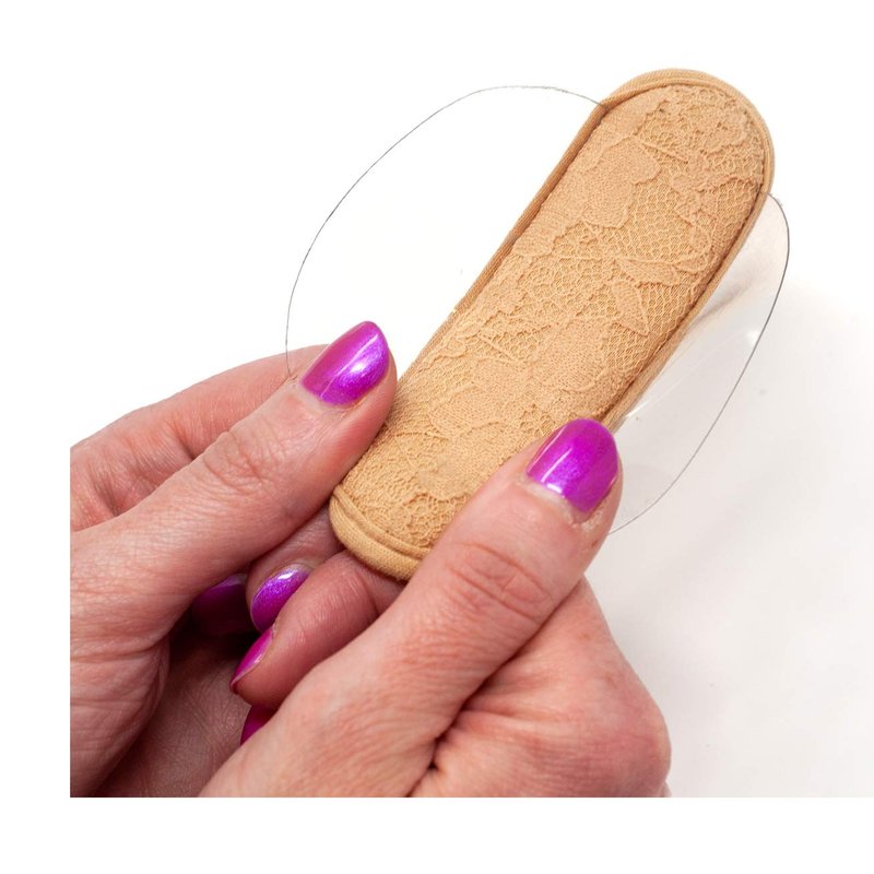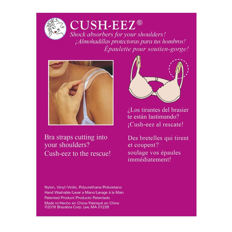 Low profile, comfy, soft and plush shoulder cushions with static stick vinyl tabs prevent bra tug and improve posture. They stay in place without Velcro tape or snaps.