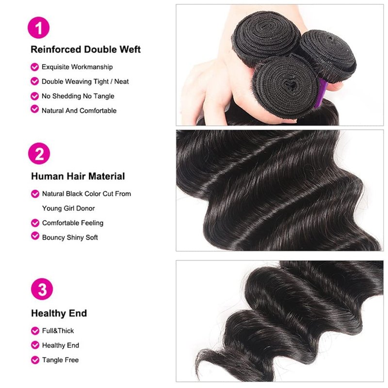 - Hair Material : 10A Brazilian Human Hair 100% Unprocessed Virgin Remy Human Hair Loose Deep Wave Bundles, Cut from The Young Healthy Female Donors.
