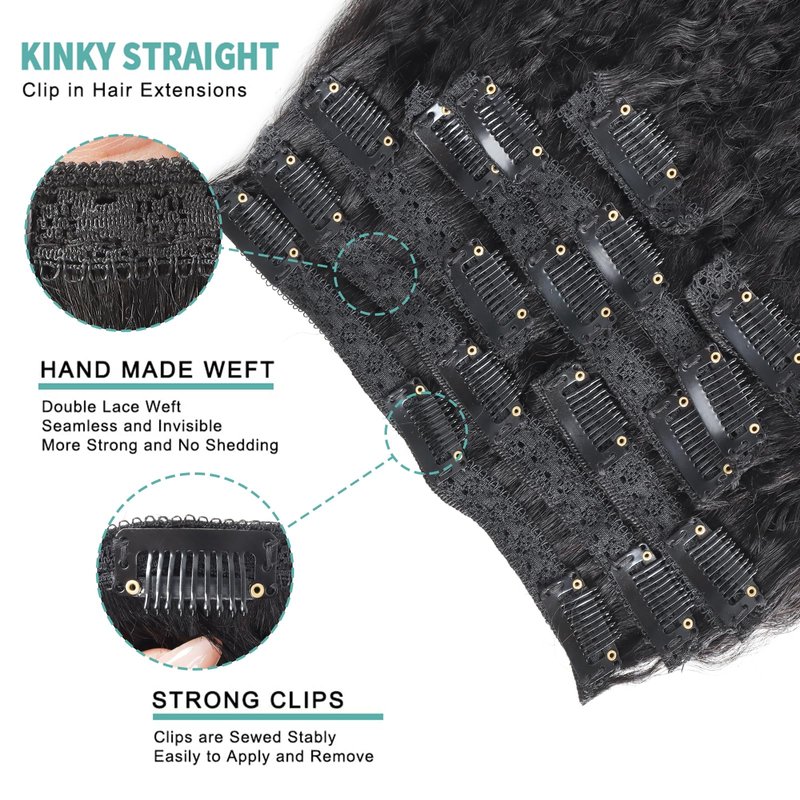 - 3.Easy to Install: Kinky stright clips in human hair extensions are secure and andlight. The clip is solid, hidden and lightweight. It is easy to install and remove to protect your natural hair and ensure your hair will look very natural.