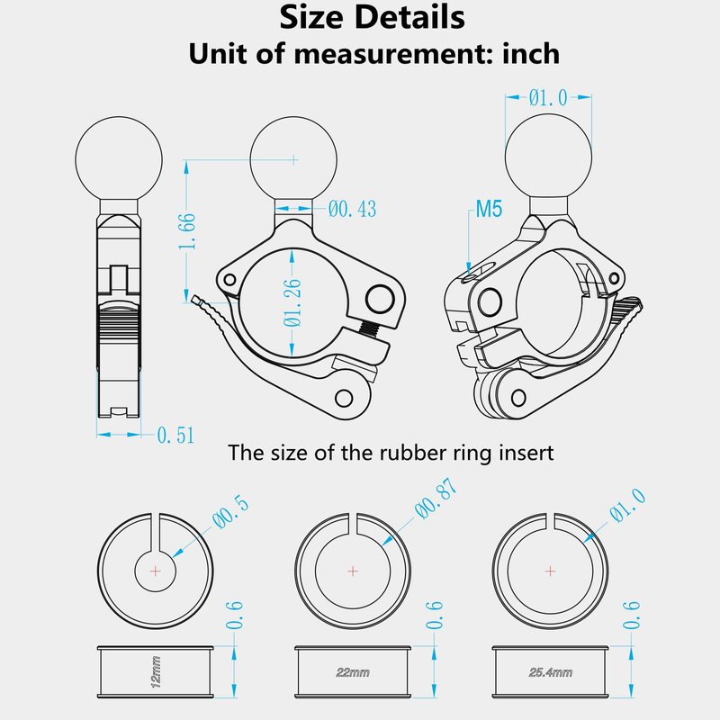 - ▶ Package come with three soft rubber ring inserts to provide a snug fit and protection of the mounting surface. Rubber ring inserts diameter: 0.5''(12mm), 0.87''(22mm), 1''(25.4mm). You can add or remove rubber ring according to the diameter of handlebar. When the rubber ring insert is not embedded, the hole diameter of the handlebar mounting base is 1.26" (32mm).