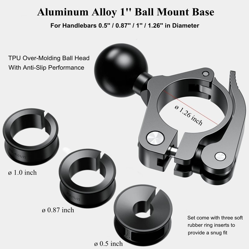 The Aluminum Alloy Handlebar Mount with 1'' TPU Ball for Rails Diameter 0.5'' 0.87'' 1'' 1.26'', Compatible with RAM Mounts B Size 1 Inch Ball Double Socket Arm, Tool-less design for easy installation or removal. Main body made of 6061-T6 aluminum alloy for durability and reliability in the most demanding environments. CNC integrated molding, smooth surface and solid body. TPU over-molding ball head, with anti-slip performance.