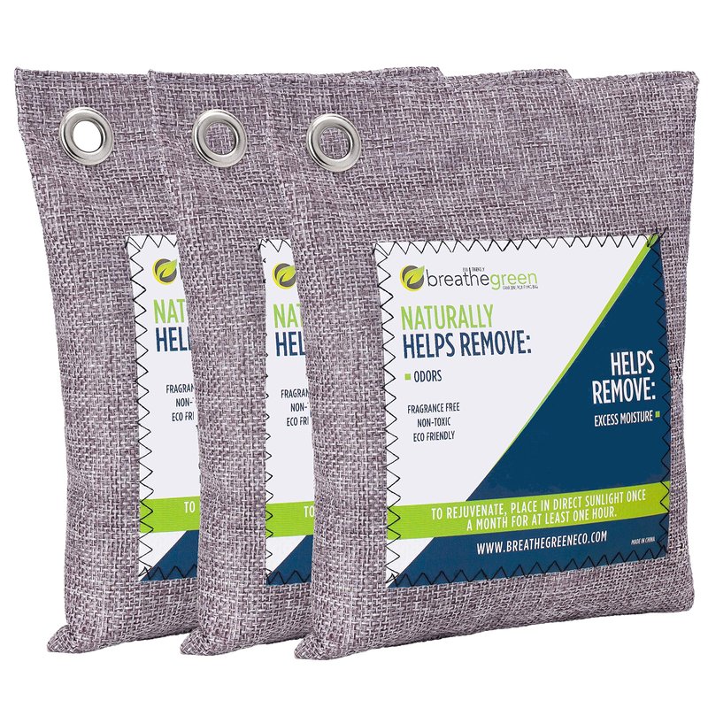 Breathe Green Bamboo Charcoal Bags Odor Absorber (3-Pack) Activated Charcoal Odor Eliminator Bag, Natural Freshener Removes Odors and Moisture, Odor Eliminator for Home, Pets, Car, Closet, RV