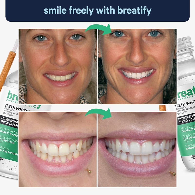 - Breatify whitening gel helps remove yellowing of tooth enamel.