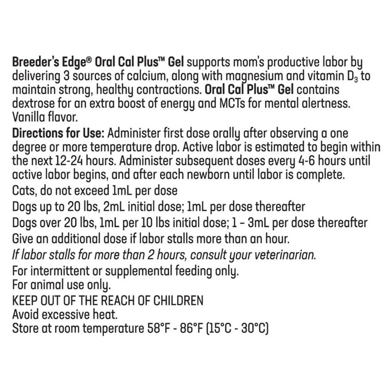 Breeder's Edge Oral Cal Plus Gel is a calcium supplement for whelping dogs and queening cats. Oral Cal Plus gel provides 3 calcium sources to support strong and normal contractions. This calcium gel for dogs and cats contains vitamins D3 and B6 to support calcium absorption while MCTs and dextrose support mental alertness and energy levels. Calcium impacts dilation, contractions and her mood, making Oral Cal Plus Gel a must-have for every whelping kit. Made in the USA with globally sourced ingredients.