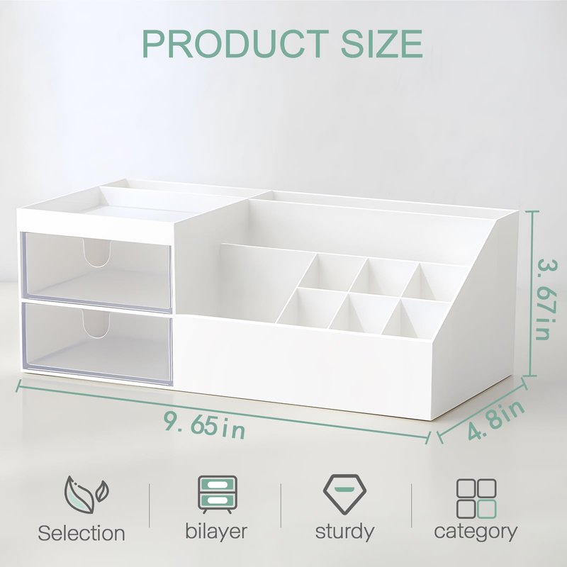 - Perfect Size - 9.65‘'L x 4.8"W x 3.67"H.The makeup organizer has 10 compartments and two small drawers