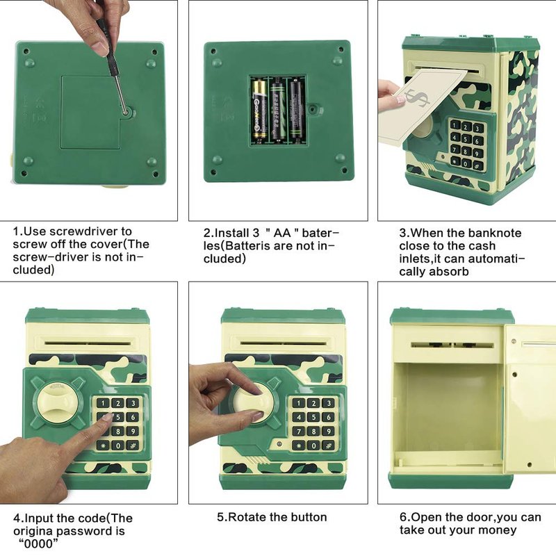 - 【Password protection】The piggy bank has a password-protected lock.The default password is 0000 ,you can change to another 4 digits password. If you Forgot your password, Please remove the battery and reinstall it after 5 minutes. The password will be restored to "0000".