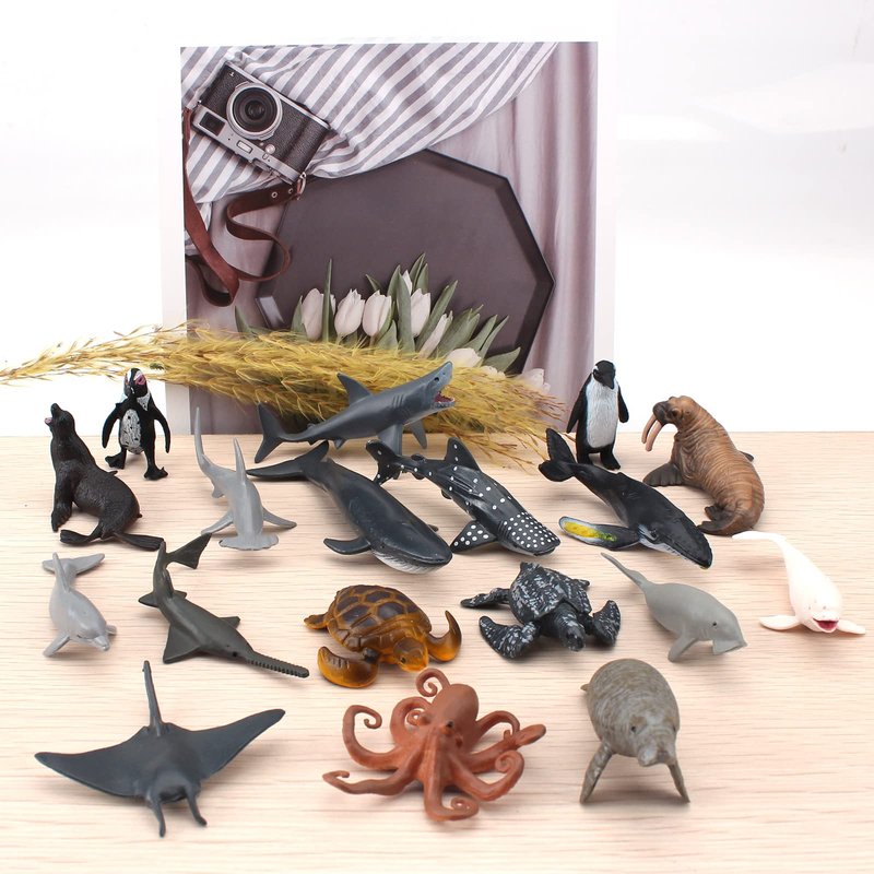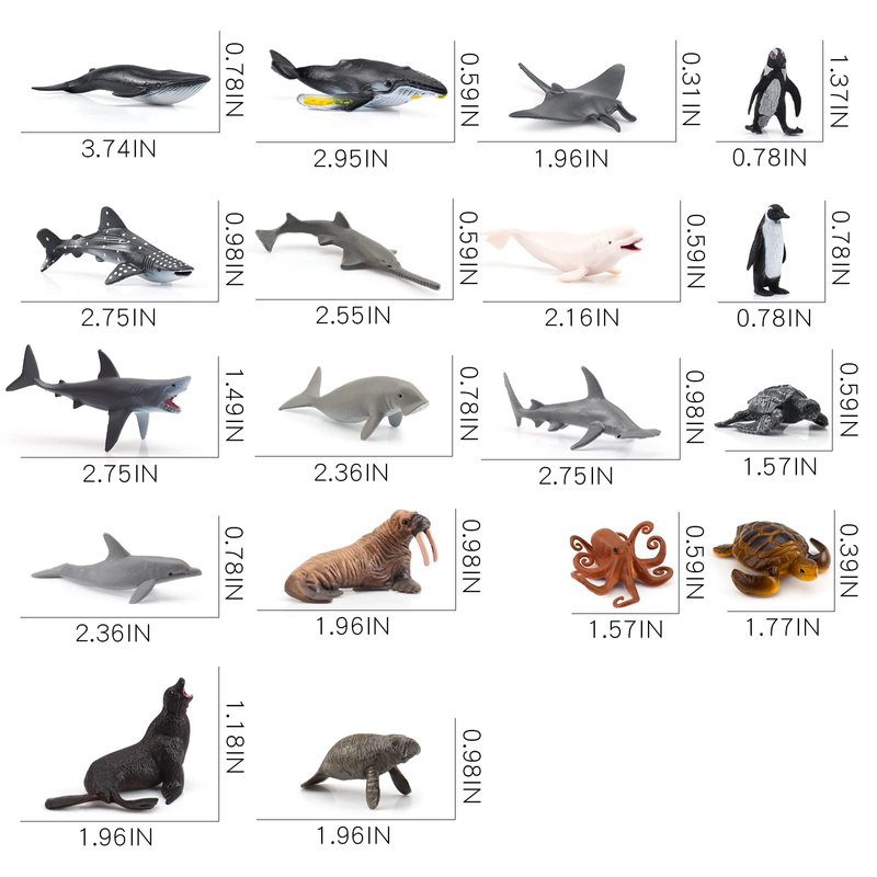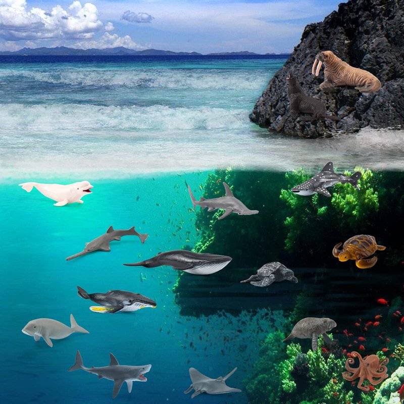 - WHAT YOU GET - 14PCS Sea Animals Figurines Set,including walrus,manatee,sea lion,emperor penguin,south african penguin,leatherback turtle,octopus,sea turtle,sea eel,white shark,blue whale,pilot whale,tiger shark.