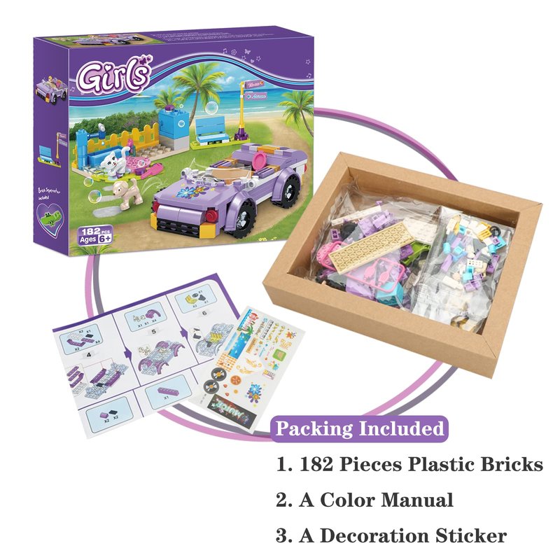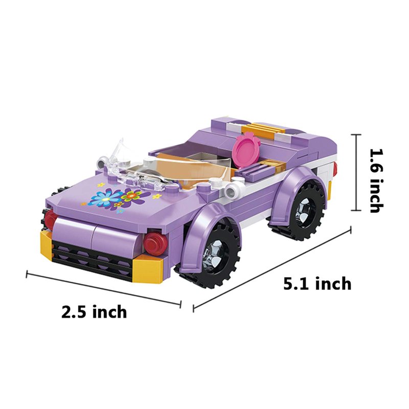 - 182 Pieces Girls Car Building Kit –The convertible car measures 5.1(L) x 2.5(W) x 1.6(H) inches. Accessories include pet grooming kit and stickers for further extend the plays.