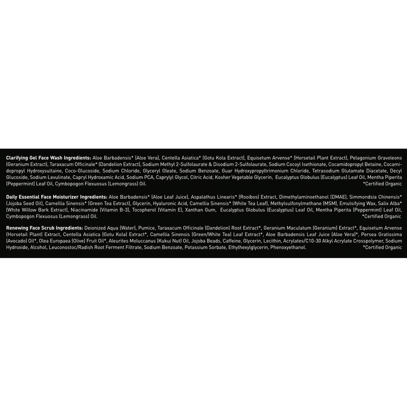 The complete daily skincare routine for men to maintain healthy skin. The three products in this men’s skin care kit work together to deliver a complete skincare routine that gives immediate and noticeable results. Designed for oily and normal skin types. How to Use It: Step 1: Wash your face morning & night with our Clarifying Gel Face Wash for men to remove facial impurities, oil, & shine which prevent a bright, clear complexion.Step 2: Gently exfoliate your skin with our Renewing Face Scrub for men 2 - 3x per week to remove dead skin cells, facial impurities, & unclog pores for a more clear complexion. Step 3: Apply our Daily Essential Face Moisturizer for men. Use in the morning to energize & protect your face. Use at night to firm the skin while you sleep. Made With Powerful, Natural Ingredients: Jojoba Beads & Pumice remove dead skin cells & other impurities from your skin without irritating. Aloe & Hyaluronic Acid: Reduces the appearance of fine lines and prevents future wrinkles. Coconut Cleansers: Deep-clean the face of dead skin, impurities, and oil. Be shine free all day. These - along with other powerful, natural ingredients - have been scientifically formulated to create the best natural skin care products for men.What Else Should You Know?The men’s skin care products in this men’s skin care set are all natural & organic. They are scented with a refreshing essential oil blend of peppermint, eucalyptus, and lemongrass. Used twice daily, this men’s skin care kit lasts approximately 45 days.All our products contain zero sulfates, parabens, glycols, phthalates, petrochemicals, silicones, PEG’s, sulfates, synthetic fragrances, or gluten. Always vegan, no animal testing, 100% Certified Organic ingredients when possible.