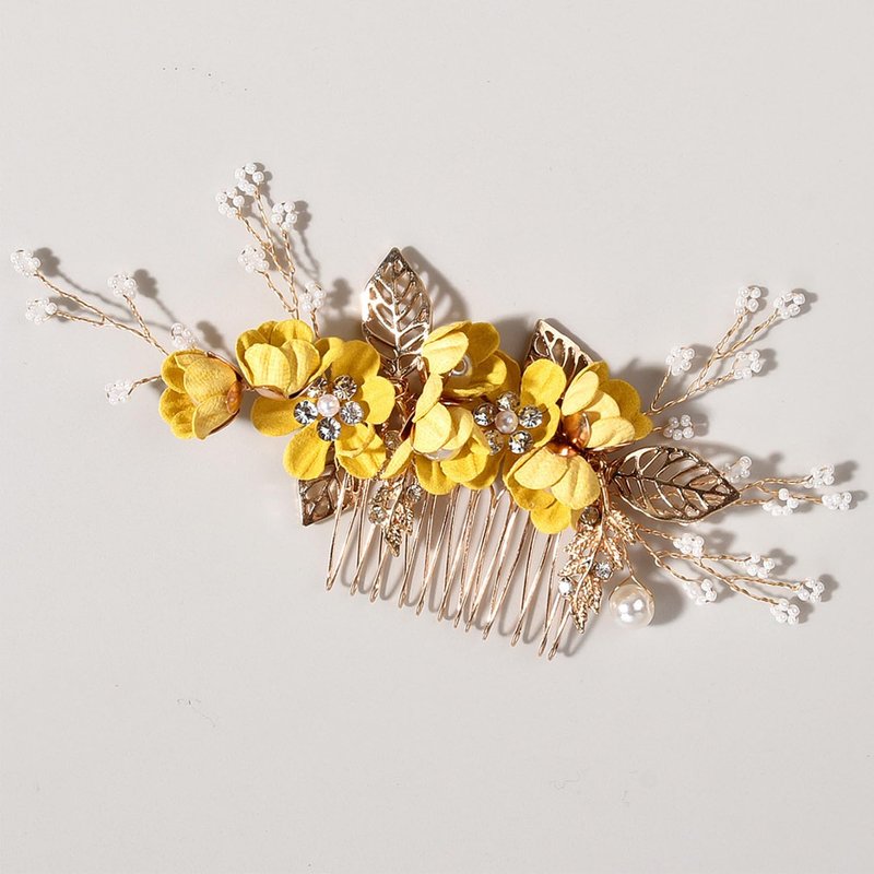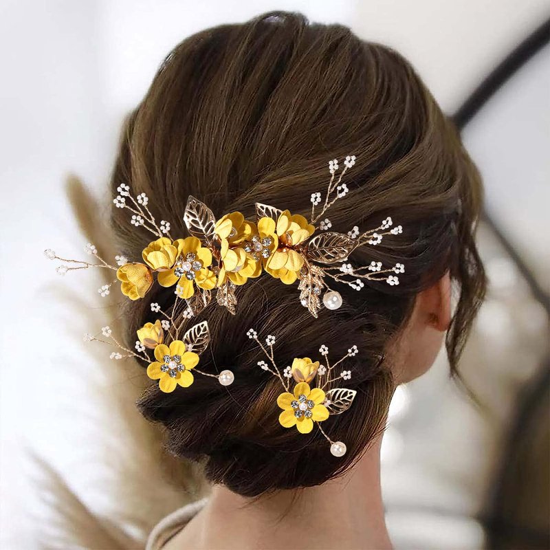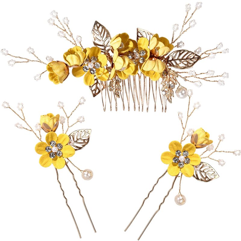 Bridal Hair Combs, Wedding Hair Comb Set Crystal Flower Hair Clips Bride Bridesmaid Hair Sides Comb Rhinestone Barrettes, Pearl Flower Hair Pins Hair Accessories for Women Girls (Yellow)