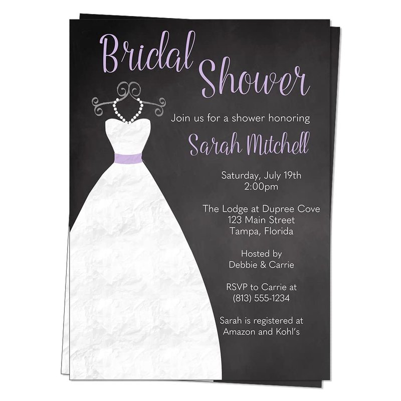 Bridal Shower Invitations Chalkboard Wedding Invites Gown Black Purple White Lavender Dress Blackboard Luncheon Pearls Customized Custom Printed Cards (12 Count)