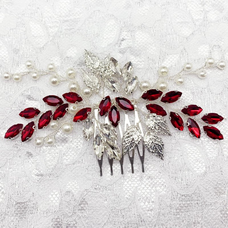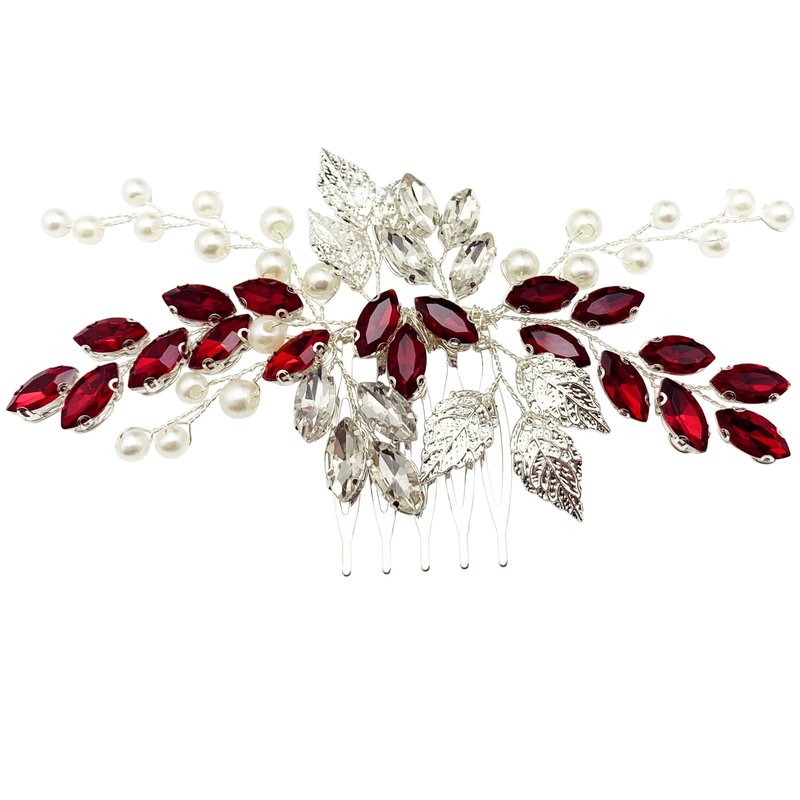 Bride Wedding Hair Comb Crystal Rhinestone Pearls Silver Leaf Hair Piece Accessories for Women Girls Homecoming Party (Wine Red)