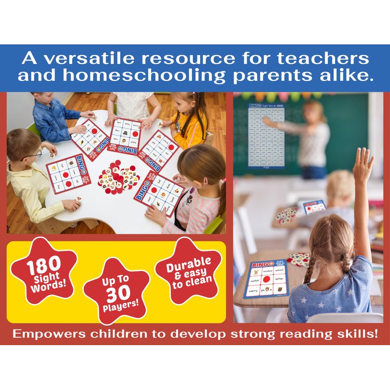 Develop essential reading skills with our sight words flash cards kindergarten; designed to make learning sight words fun and engaging for young learners Our Kindergarten sight word flash cards Level 1&2 includes 30 double sided Bingo Cards 7.25 x 8.75 inches; 65 double sided Calling Cards plus 10 Challenges; 276 durable plastic Bingo Chips; 1 large Sight Word poster 17.5 x 22.75 inches and 1 Instruction page Introduce our Bingo Game Sight Words to your child’s learning routine and watch their reading abilities soar; This kindergarten flash cards age 4-5 game will be a great additional to your kid’s learning materials Give your child a head start in reading with our interactive educational learning game, providing valuable reading cards to help for 1st grade students and learn how to read for kids 5 to 7 Our game is the perfect educational tool to help your child ages 5 to 7; kids can learn how to read and master reading at their own pace