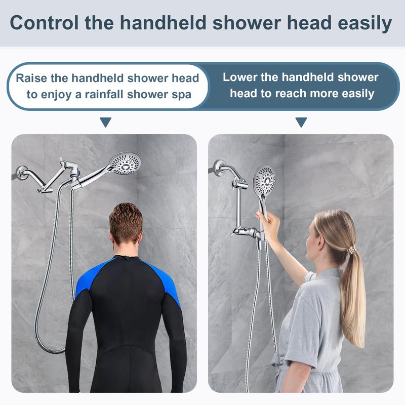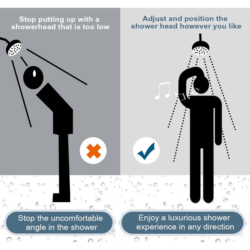- ADJUSTABLE SHOWER ARM EXTENDER - You can easily adjust the height of the shower head to your liking. Raise a low-hanging rainfall shower head for more showering coverage or lower a handheld shower head to reach more easily