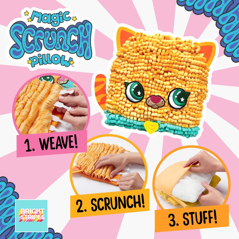 Bright Stripes Magic Scrunch Pillow Making Kit - No Sew Pillow Craft Kit for Kids - Make Your Own Pillow Kit - DIY Pillow Kit for Kids (Kitty)