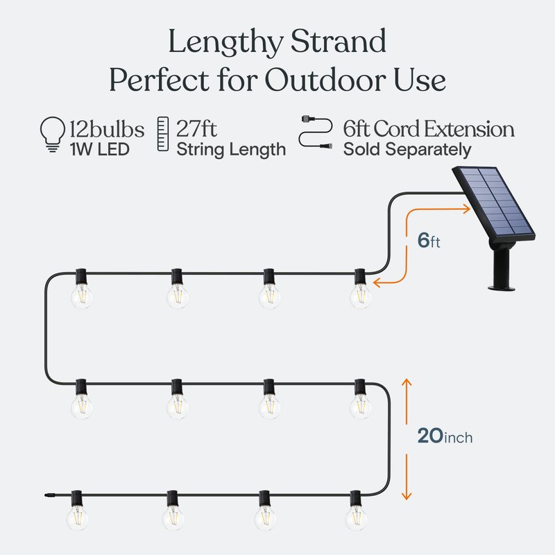 - Durable LED Solar Powered Outdoor String Lights: 27 ft long string lights with 12 replaceable LED bulbs and detachable solar panel with on/off switch located on the back. 20'' between bulbs and 6' between the solar panel and first bulb. The lit portion is 20 feet long. LED bulbs last 20,000 hours and solar panel is rated at 1,000 charge lifespan (can last approximately 2.5 years). Direct sunlight is best for a full charge, though you can get some use from charging in indirect light.