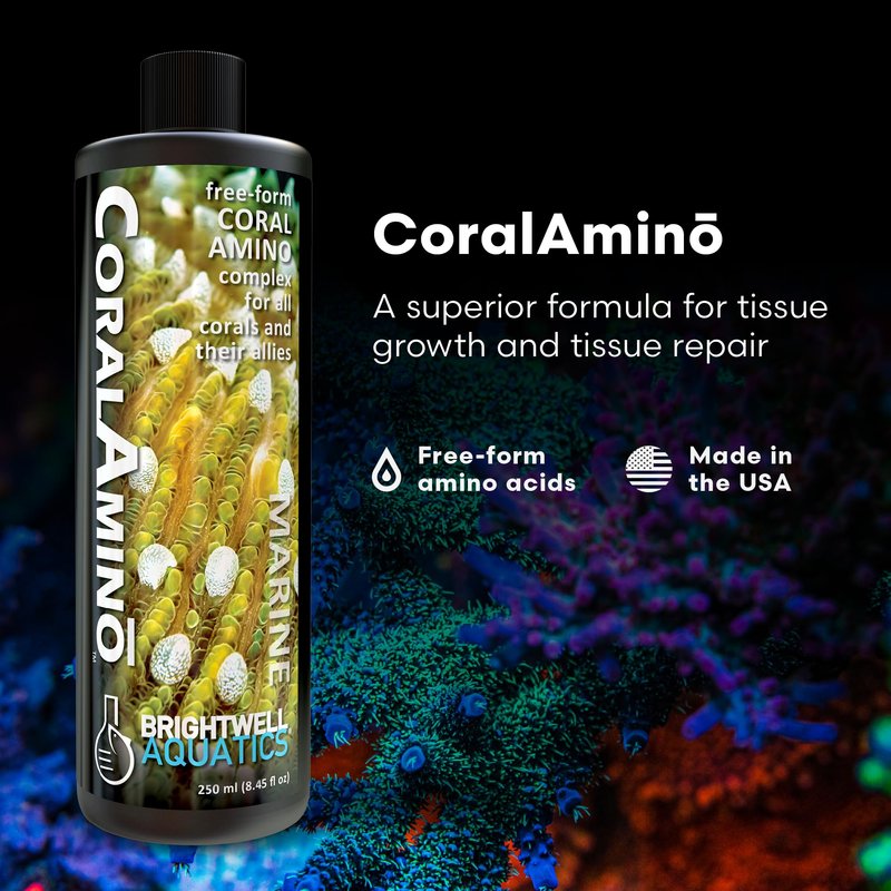 - ENHANCED GROWTH – CoralAmino is an amino acid complex for maximum aquarium coral growth and coloration in all corals. This free-form amino acid supplement closely mirrors the natural ratios found in stony corals, boosting the corals' assimilation of proteins for building proteins for coral tissue growth and tissue repair